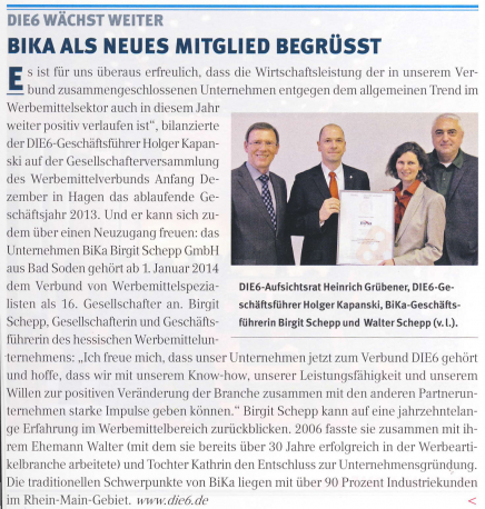 „Es ist für uns überaus erfreulich, dass die Wirtschaftsleistung der in unserem Verbund zusammengeschlossenen Unternehmen entgegen dem allgemeinen Trend im Werbemittelsektor auch in diesem Jahr weiter positiv verlaufen ist.“ So der DIE6-Geschäftsführer Holger Kapanski mit einer vorsichtigen ersten Bilanz auf der Gesellschafterversammlung des Werbemittelverbunds Anfang Dezember in Hagen zum abgelaufenen Geschäftsjahr 2013. „Darüber hinaus freue ich mich, dass unser Verbund weiter wächst und wir mit dem Unternehmen BiKa  Birgit Schepp GmbH den nunmehr 16. Gesellschafter in unserem Kreise ab 01.01.2014 begrüßen dürfen.“