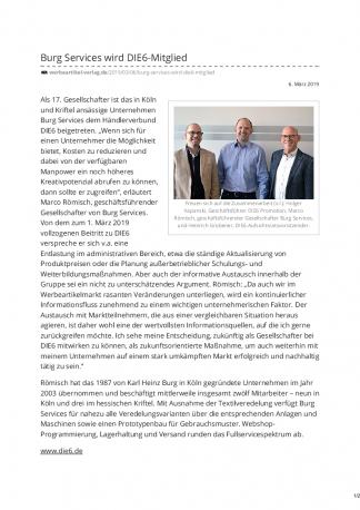 Als 17. Gesellschafter ist das in Köln und Kriftel ansässige Unternehmen Burg Services dem Händlerverbund DIE6 beigetreten. „Wenn sich für einen Unternehmer die Möglichkeit bietet, Kosten zu reduzieren und dabei von der verfügbaren Manpower ein noch höheres Kreativpotenzial abrufen zu können, dann sollte er zugreifen“, erläutert Marco Römisch, geschäftsführender Gesellschafter von Burg Services. Von dem zum 1. März 2019 vollzogenen Beitritt zu DIE6 verspreche er sich v.a. eine Entlastung im administrativen Bereich, etwa die ständige Aktualisierung von Produktpreisen oder die Planung außerbetrieblicher Schulungs- und Weiterbildungsmaßnahmen. Aber auch der informative Austausch innerhalb der Gruppe sei ein nicht zu unterschätzendes Argument. Römisch: „Da auch wir im Werbeartikelmarkt rasanten Veränderungen unterliegen, wird ein kontinuierlicher Informationsfluss zunehmend zu einem wichtigen unternehmerischen Faktor. Der Austausch mit Marktteilnehmern, die aus einer vergleichbaren Situation heraus agieren, ist daher wohl eine der wertvollsten Informationsquellen, auf die ich gerne zurückgreifen möchte. Ich sehe meine Entscheidung, zukünftig als Gesellschafter bei DIE6 mitwirken zu können, als zukunftsorientierte Maßnahme, um auch weiterhin mit meinem Unternehmen auf einem stark umkämpften Markt erfolgreich und nachhaltig tätig zu sein.“ Römisch hat das 1987 von Karl Heinz Burg in Köln gegründete Unternehmen im Jahr 2003 übernommen und beschäftigt mittlerweile insgesamt zwölf Mitarbeiter – neun in Köln und drei im hessischen Kriftel. Mit Ausnahme der Textilveredelung verfügt Burg Services für nahezu alle Veredelungsvarianten über die entsprechenden Anlagen und Maschinen sowie einen Prototypenbau für Gebrauchsmuster. Webshop- Programmierung, Lagerhaltung und Versand runden das Fullservicespektrum ab.