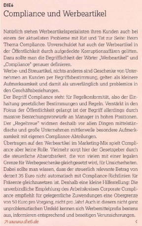Natürlich stehen Werbeartikelspezialisten ihren Kunden auch bei einem der aktuellsten Probleme mit Rat und Tat zur Seite: Beim The-ma Compliance. Unverschuldet hat auch der Werbeartikel in der Öf-fentlichkeit durch aufgedeckte Korruptionsaffären gelitten. Dazu sollte man die Begrifflichkeit der Wörter „Werbeartikel“ und „Compliance“ genauer definieren.