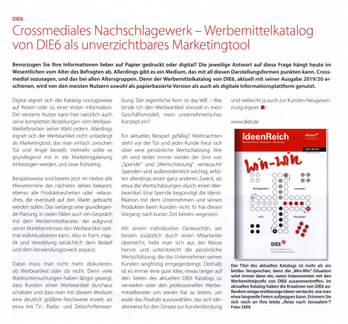 Bevorzugen Sie Ihre Informationen lieber auf Papier gedruckt oder digital? Die jeweilige Antwort auf diese Frage hängt heute im Wesentlichen vom Alter des Befragten ab. Allerdings gibt es ein Medium, das mit all diesen Darstellungsformen punkten kann. Crossmedial sozusagen, und das bei allen Altersgruppen. Denn der Werbemittelkatalog von DIE6, aktuell mit seiner Ausgabe 2019/20 erschienen, wird von den meisten Nutzern sowohl als papierbasierte Version als auch als digitale Informationsplattform genutzt.