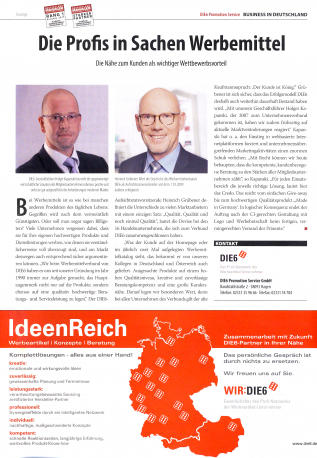 „Was der Kunde im Internetauftritt oder im jährlich zwei Mal aufgelegten Werbemittelkatalog sieht, das bekommt er von unseren Kollegen in Deutschland und Österreich auch geliefert. Ausgesuchte Produkte auf einem hohen Qualitätsniveau, kreative und zuverlässige Beratungskompetenz und eine große Kundennähe. Darauf legen wir besonderen Wert, denn bei allen Unternehmen des Verbunds gilt der alte Kaufmannsspruch noch: „Der Kunde ist König“.“ Grübener ist sich sicher, dass das Erfolgsmodell DIE6 deshalb auch weiterhin dauerhaft Bestand haben wird. „Mit unserem Geschäftsführer Holger Kapanski, der 2007 zum Unternehmensverbund gekommen ist, haben wir zudem frühzeitig auf aktuelle Marktveränderungen reagiert.“ Kapanski hat unter anderem den Einstieg in webbasierte Internetplattformen forciert und unternehmensübergreifenden Marketingaktivitäten einen enormen Schub verliehen.