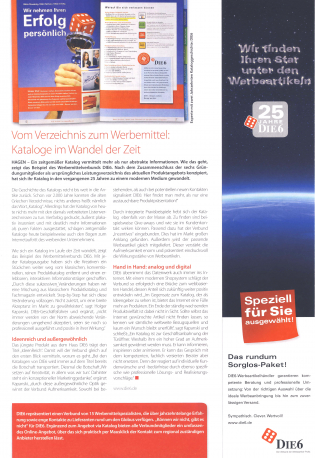Wobei man beim klassischen Begriff angelangt ist. Der Katalog als eigentliches Nachschlagewerk wird heute vielfach auch mit Werbung gleichgesetzt, dabei kann er deutlich mehr leisten. Nehmen wir das Beispiel des aktuellen Werbemittelkatalogs von DIE6. Nach dem Zusammenschluss der sechs Gründungsmitglieder als ursprüngliches Leistungsverzeichnis des aktuellen Produktangebots konzipiert, hat er sich in den vergangenen 25 Jahren zu einem modernen Medium gewandelt. Absolut zeitgemäß, zu deutlich mehr in der Lage, als nur abstrakte Informationen zu transportieren.