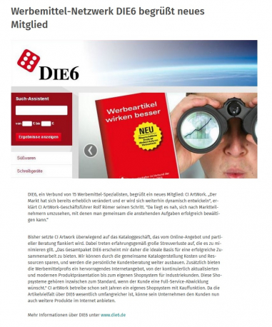 Bisher setzte CI Artwork überwiegend auf das Kataloggeschäft, das vom Online-Angebot und partieller Beratung flankiert wird. Dabei treten erfahrungsgemäß große Streuverluste auf, die es zu minimieren gilt. „Das Gesamtpaket DIE6 erscheint mir daher die ideale Basis für eine erfolgreiche Zusammenarbeit zu bieten. Wir können durch die gemeinsame Katalogerstellung Kosten und Ressourcen sparen, und werden die persönliche Kundenberatung weiter ausbauen. Zusätzlich bieten die Werbemittelprofis ein hervorragendes Internetangebot, von der kontinuierlich aktualisierten und modernen Produktpräsentation bis zum eigenen Shopsystem für Industriekunden. Diese Shopsysteme gehören inzwischen zum Standard, wenn der Kunde eine Full-Service Abwicklung wünscht. Schon seit Jahren betreiben wir ein eigenes Shopsystem mit Kauffunktion. Da die Artikelvielfalt über DIE6 wesentlich umfangreicher ist, können wir unseren Kunden nun auch weitere Produkte zur Auswahl im Internet anbieten. Bei über 30.000 Artikeln über das DIE6 Anfrage-Shopsystem, ist eine professionelle Beratung unausweichlich. Allein die Möglichkeiten der Logoanbringungen sind so vielfältig, dass wir daher gern das Anfrage-Shopsystem zusätzlich zu unserem eigenen Shopsystem mit Kauffunktion ergänzen werden. Das wird unseren wachsenden Ansprüchen im Onlinebereich, wir verzeichnen hier einen prozentualen Anteil von zehn bis 15 Prozent – Tendenz steigend, in vollem Umfang gerecht. Nicht zu vergessen die Kosteneffizienz, die sich bei gemeinsamer Listung der Zulieferer ergibt.“