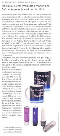 Individualisierung ist dabei eine der wirksamsten Optionen bei einer Vielzahl von Aktionen, bei denen Werbemittel mit nachhaltigem Erfolg eingesetzt werden können. Dabei liefern die eigenen Unternehmensaktivitäten häufig die idealen Steilvorlagen. Sei es die Neueinführung eines Produkts, das Relaunch des Corporate Identity, die aktuelle Werbekampagne oder eine direkte Ansprache bestimmter Zielgruppen, bei denen ein werbewirksamer Auftritt inszeniert werden soll.