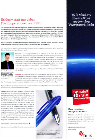Die Spezialisten von DIE6 beschreiten daher immer auch innovative Wege. Beispielsweise in dem man den engen Schulterschluss mit seinen Lieferanten sucht. Wie positiv diese Zusammenarbeit verlaufen kann, dokumentierte man in 2011, als man sich für das Schreibgerät „Look“ das Alleinvertriebsrecht für Deutschland, Österreich und die Schweiz gesichert hat.