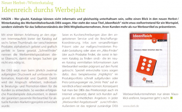 Wer glaubt, Kataloge können nicht unterhaltsam und informativ sein, sollte einen Blick in den neuen Herbst-/Winterkatalog des Werbemittelverbunds DIE6 werfen. Hier steht der neue Titel „IdeenReich“ nicht etwa stellvertretend für ein Wortspiel, sondern vielmehr für das Selbstverständnis der DIE6 Mitgliedsunternehmen, ihren Kunden mehr als nur Werbeartikel zu präsentieren.
