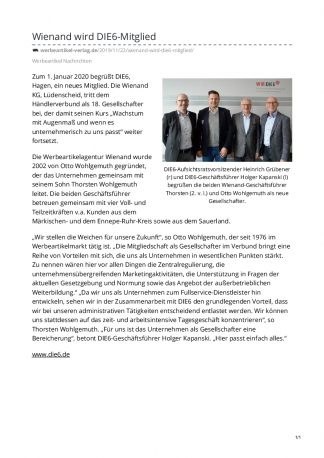 Man ist mit dem Beitritt zu DIE6 mehr als zufrieden bei der Wienand KG. „Für uns ist das Unternehmen als Gesellschafter eine Bereicherung“, formuliert es auch DIE6 Geschäftsführer Holger Kapanski. „Hier passt einfach alles, die geballte Fachkompetenz, die Einsatzbereitschaft, das Verständnis für den Markt und der Wille zur Zusammenarbeit.“