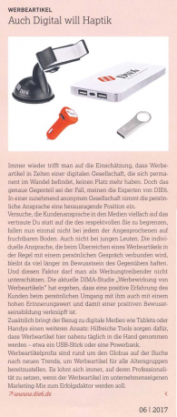 Zusätzlich bringt der Bezug zu digitale Medien wie Tablets oder Handys einen weiteren Ansatz: Hilfreiche Tools sorgen dafür, dass auch hier Werbeartikel nahezu täglich in die Hand genommen wer-den. Etwa in Form eines USB-Sticks, einer Powerbank oder einer Kfz-Smartphone-Halterung.