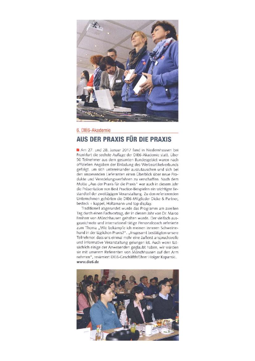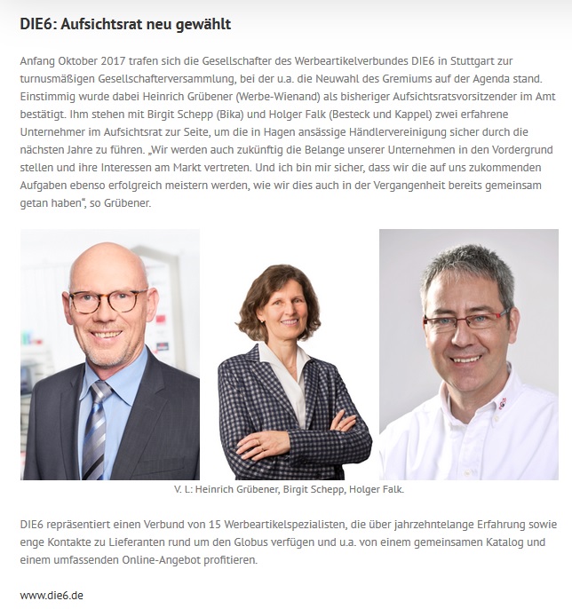 Im DIE6-Pressearchiv finden Sie zahlreiche Artikel und Informationen vom und über das Profi-Netzwerk der Werbeartikel-Unternehmer.
