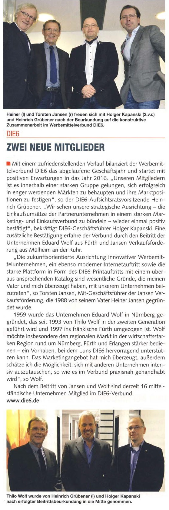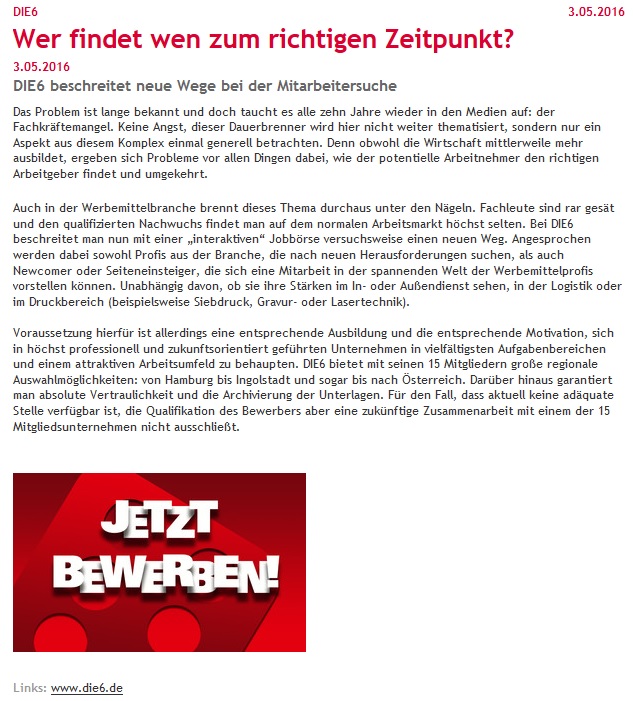 Im DIE6-Pressearchiv finden Sie zahlreiche Artikel und Informationen vom und über das Profi-Netzwerk der Werbeartikel-Unternehmer.