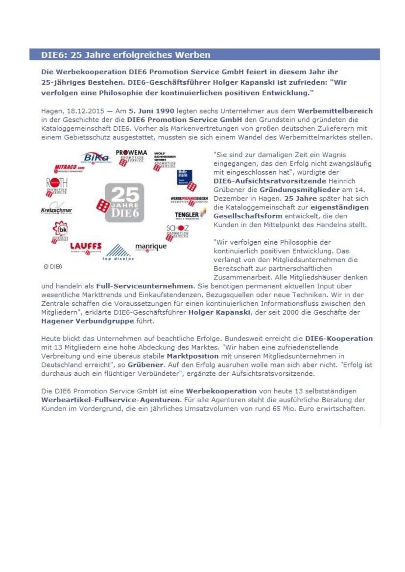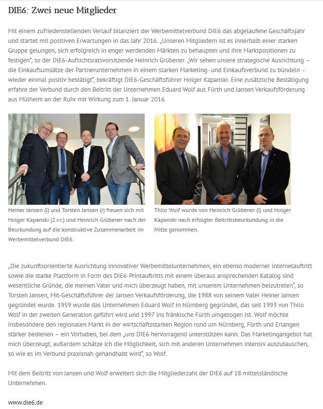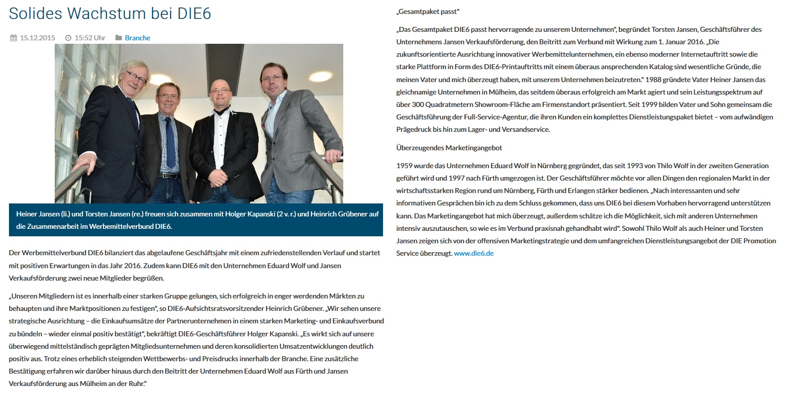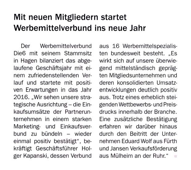 Im DIE6-Pressearchiv finden Sie zahlreiche Artikel und Informationen vom und über das Profi-Netzwerk der Werbeartikel-Unternehmer.