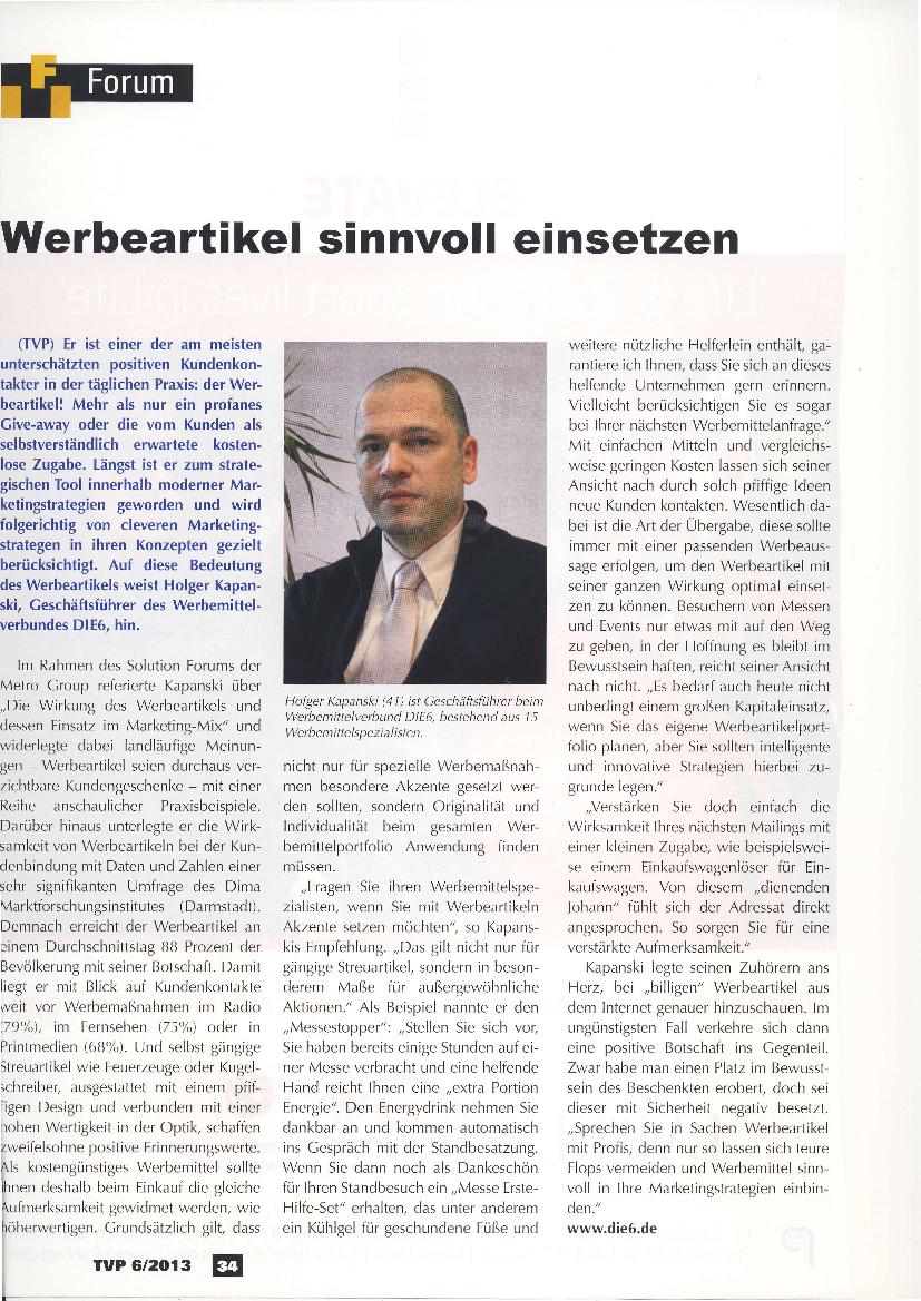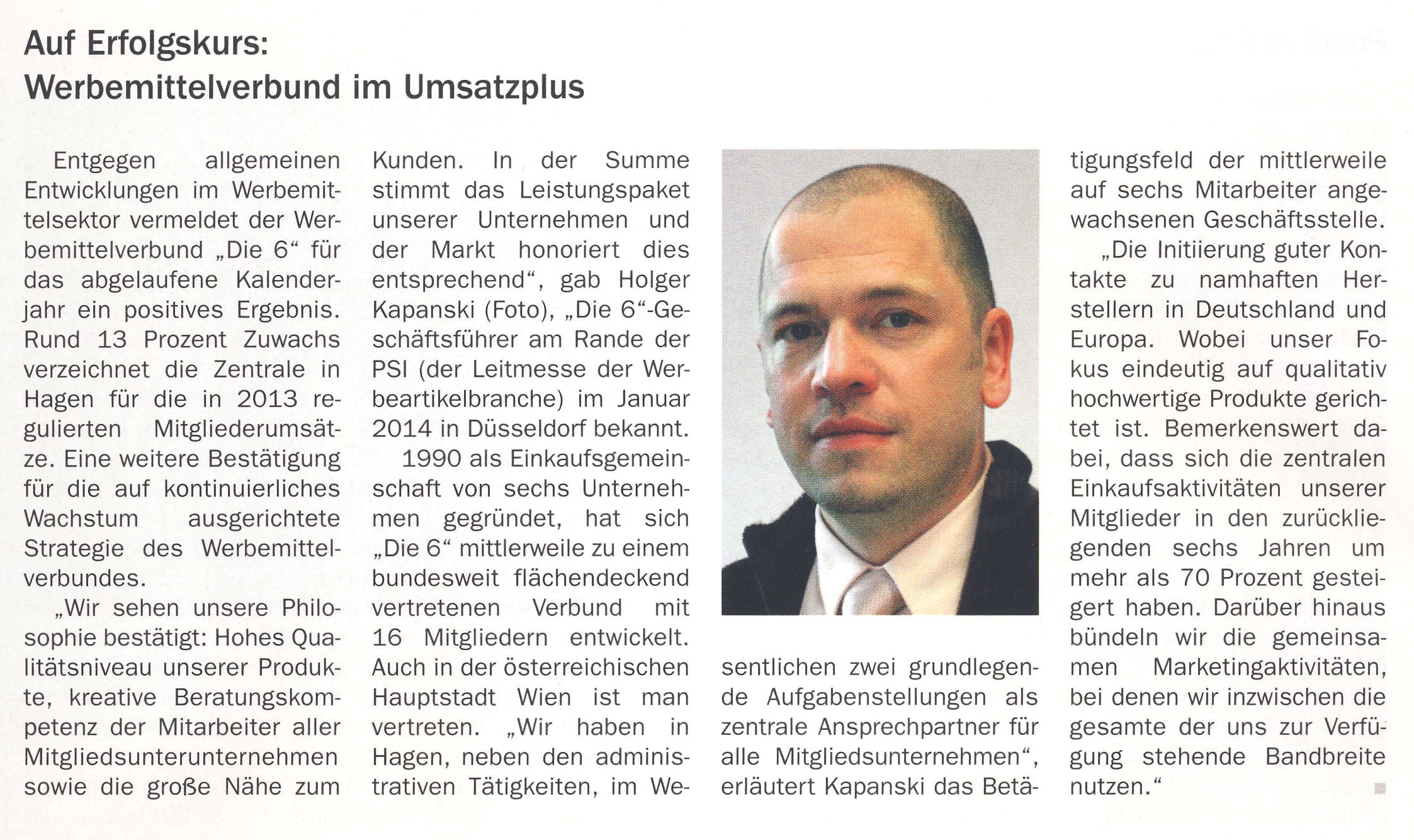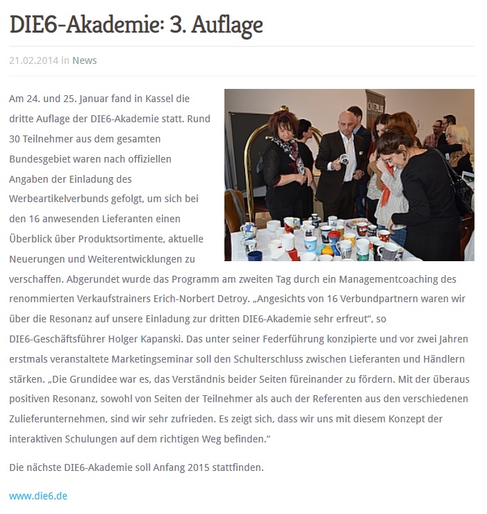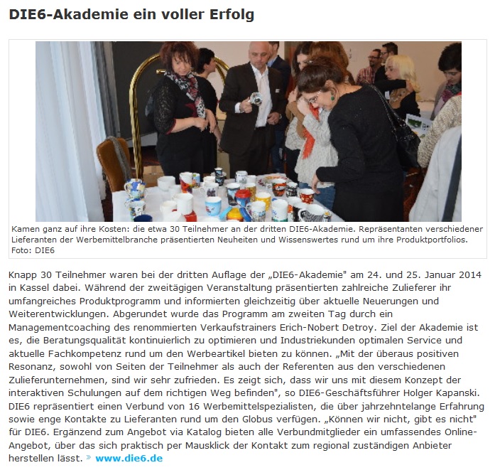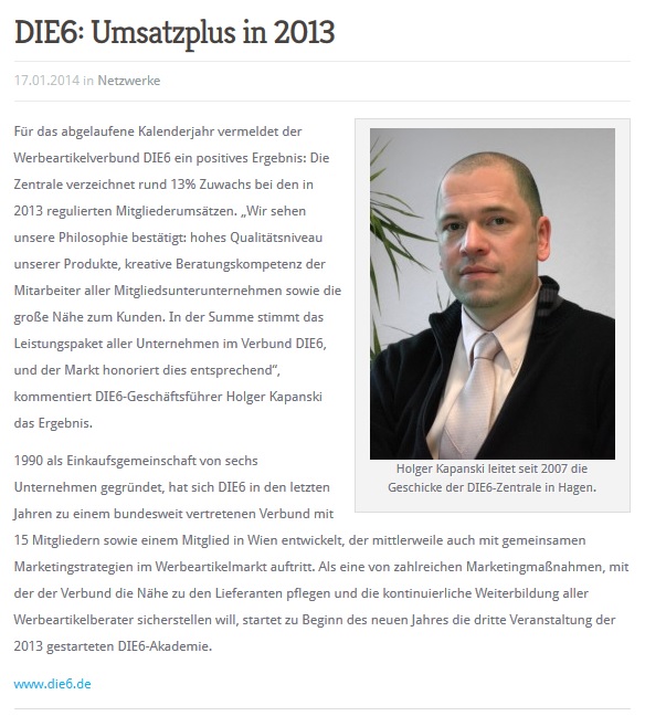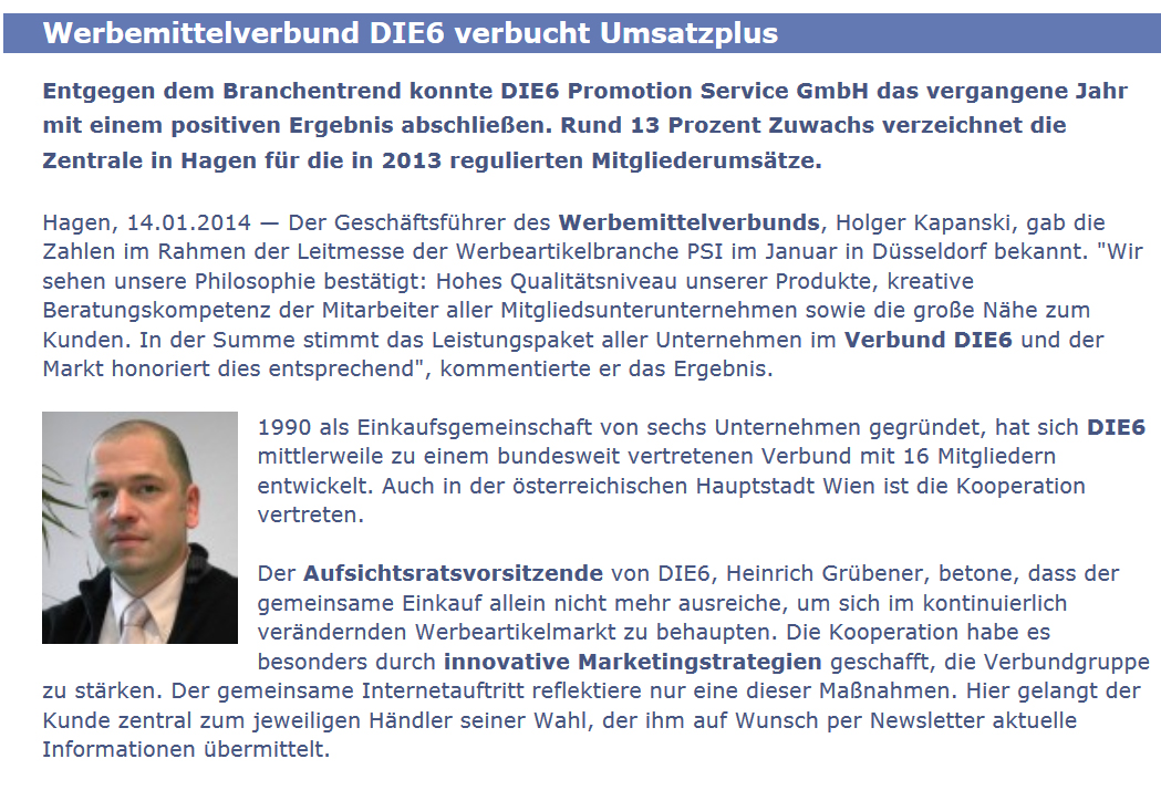 Im DIE6-Pressearchiv finden Sie zahlreiche Artikel und Informationen vom und über das Profi-Netzwerk der Werbeartikel-Unternehmer.