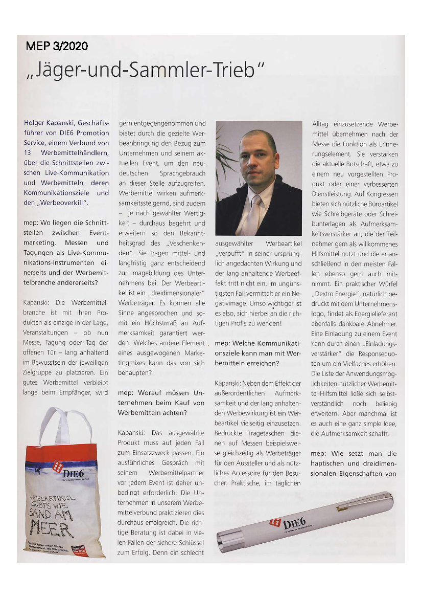 Im DIE6-Pressearchiv finden Sie zahlreiche Artikel und Informationen vom und über das Profi-Netzwerk der Werbeartikel-Unternehmer.