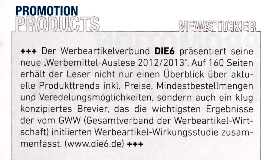 Im DIE6-Pressearchiv finden Sie zahlreiche Artikel und Informationen vom und über das Profi-Netzwerk der Werbeartikel-Unternehmer.