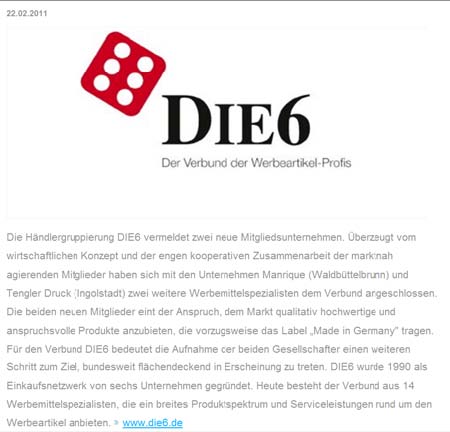 Im DIE6-Pressearchiv finden Sie zahlreiche Artikel und Informationen vom und über das Profi-Netzwerk der Werbeartikel-Unternehmer.