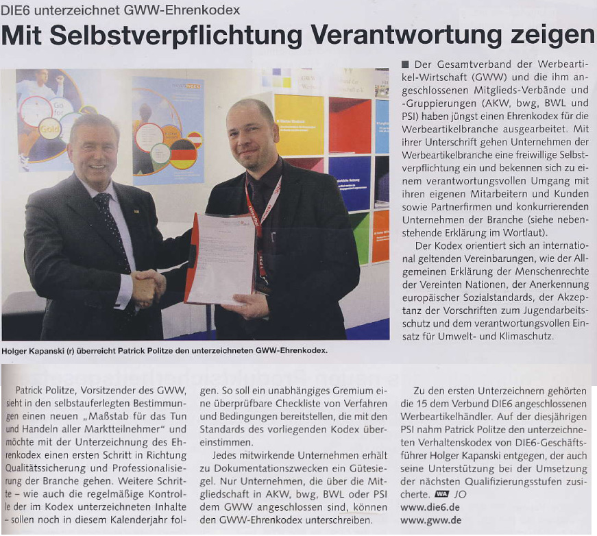 DIE6 Gruppe unterzeichnet GWW-Ehrenkodex