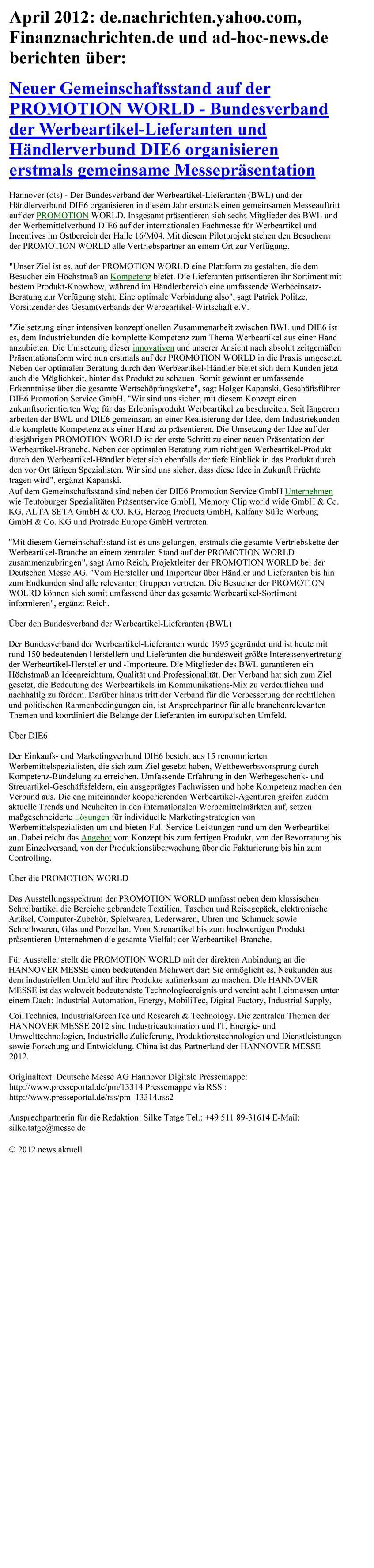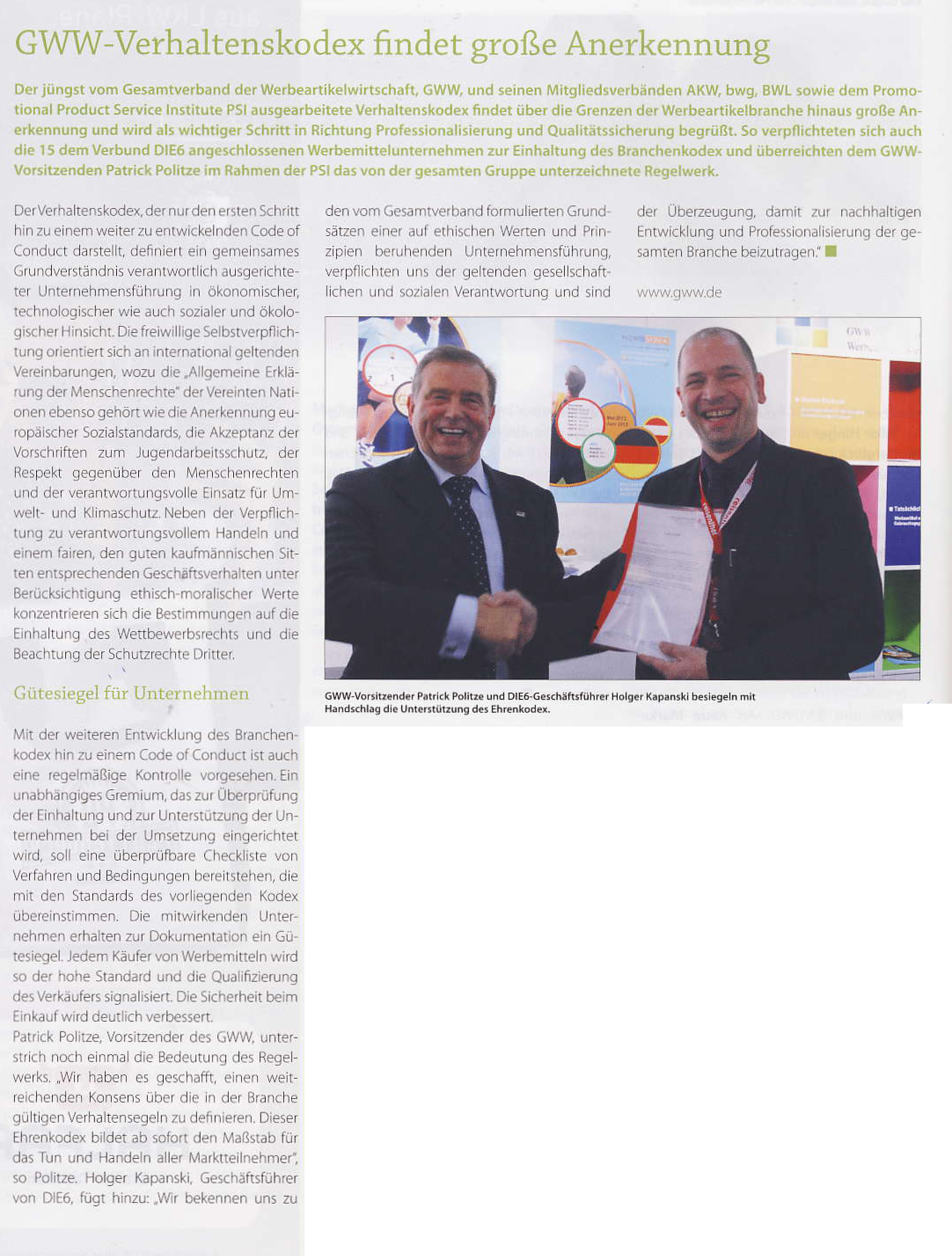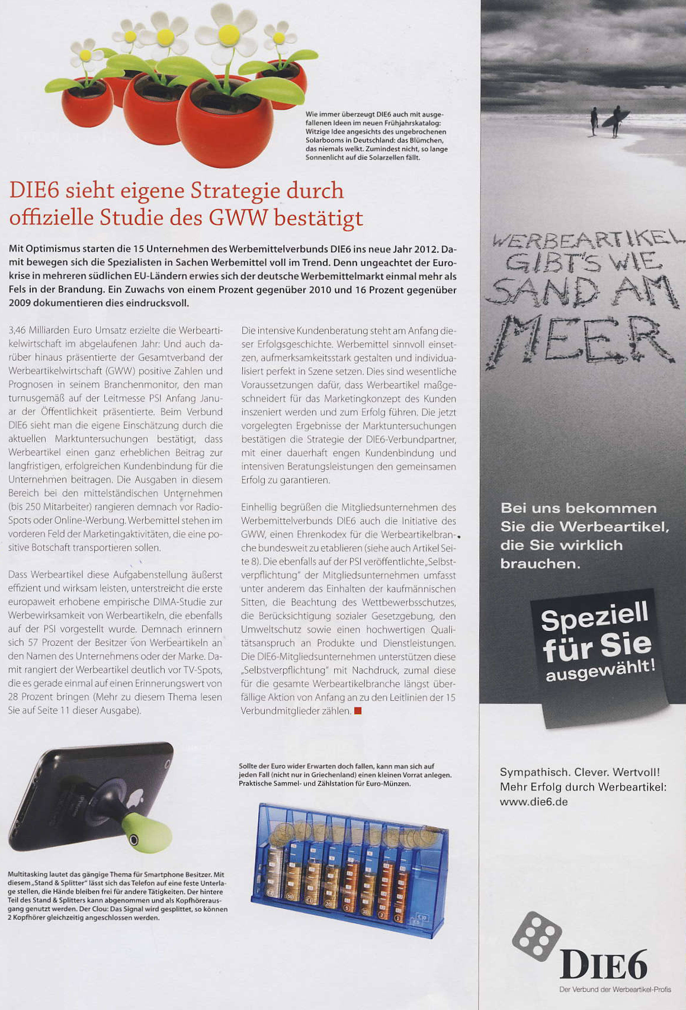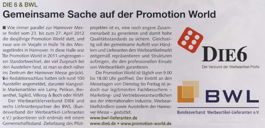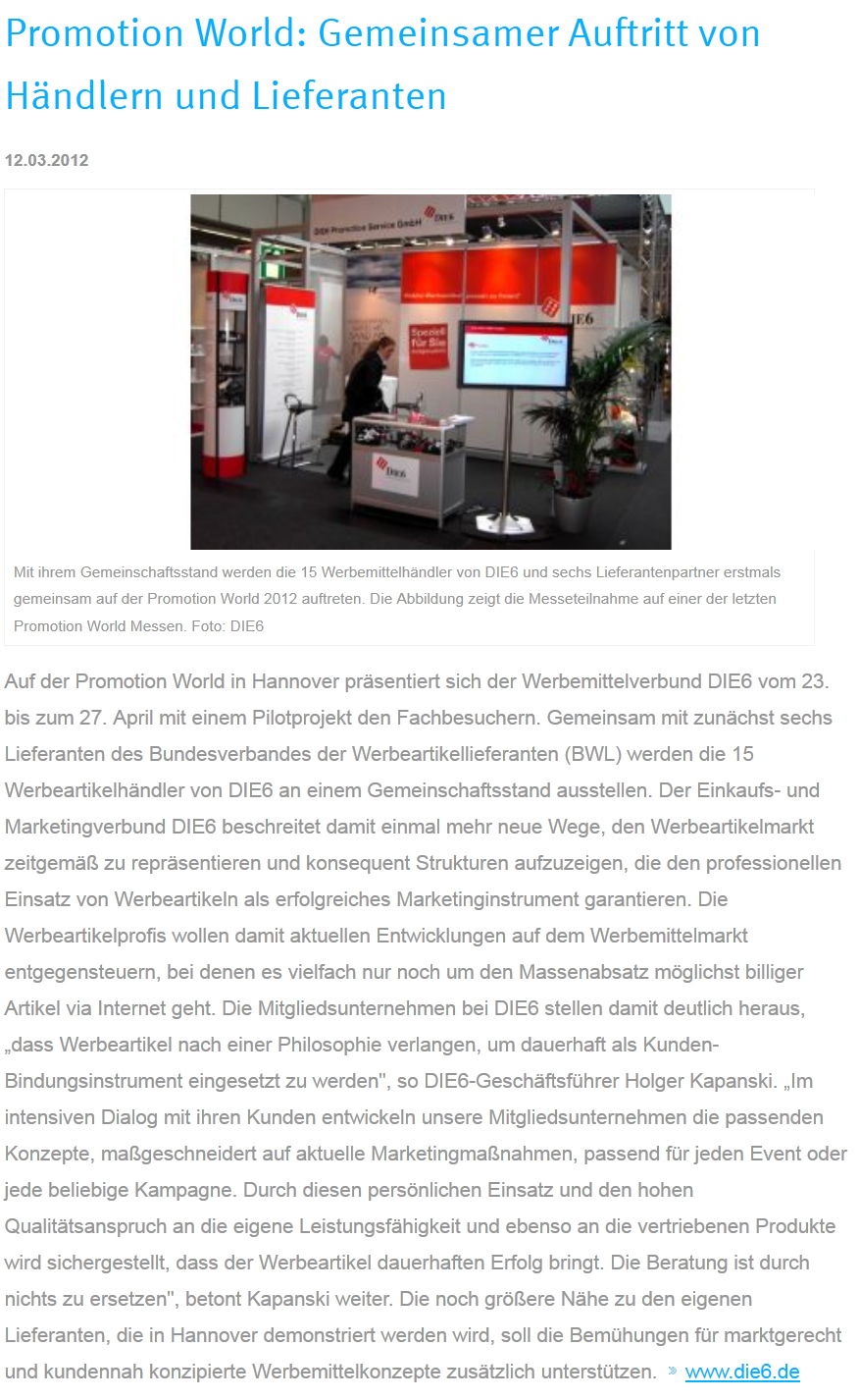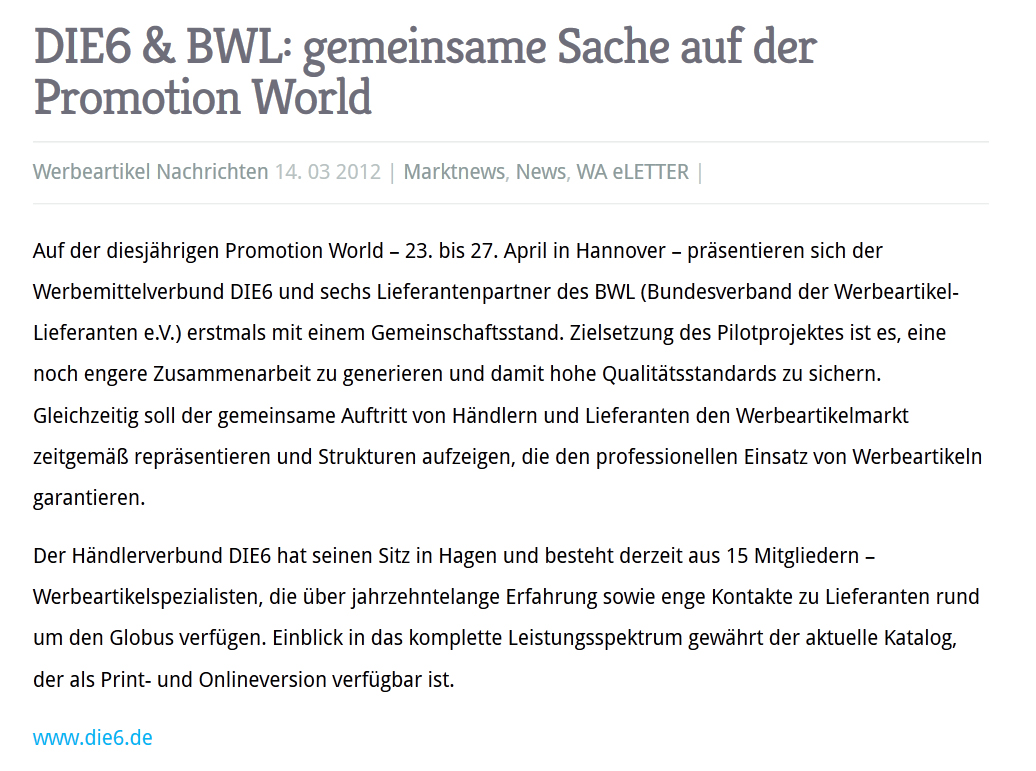 Im DIE6-Pressearchiv finden Sie zahlreiche Artikel und Informationen vom und über das Profi-Netzwerk der Werbeartikel-Unternehmer.