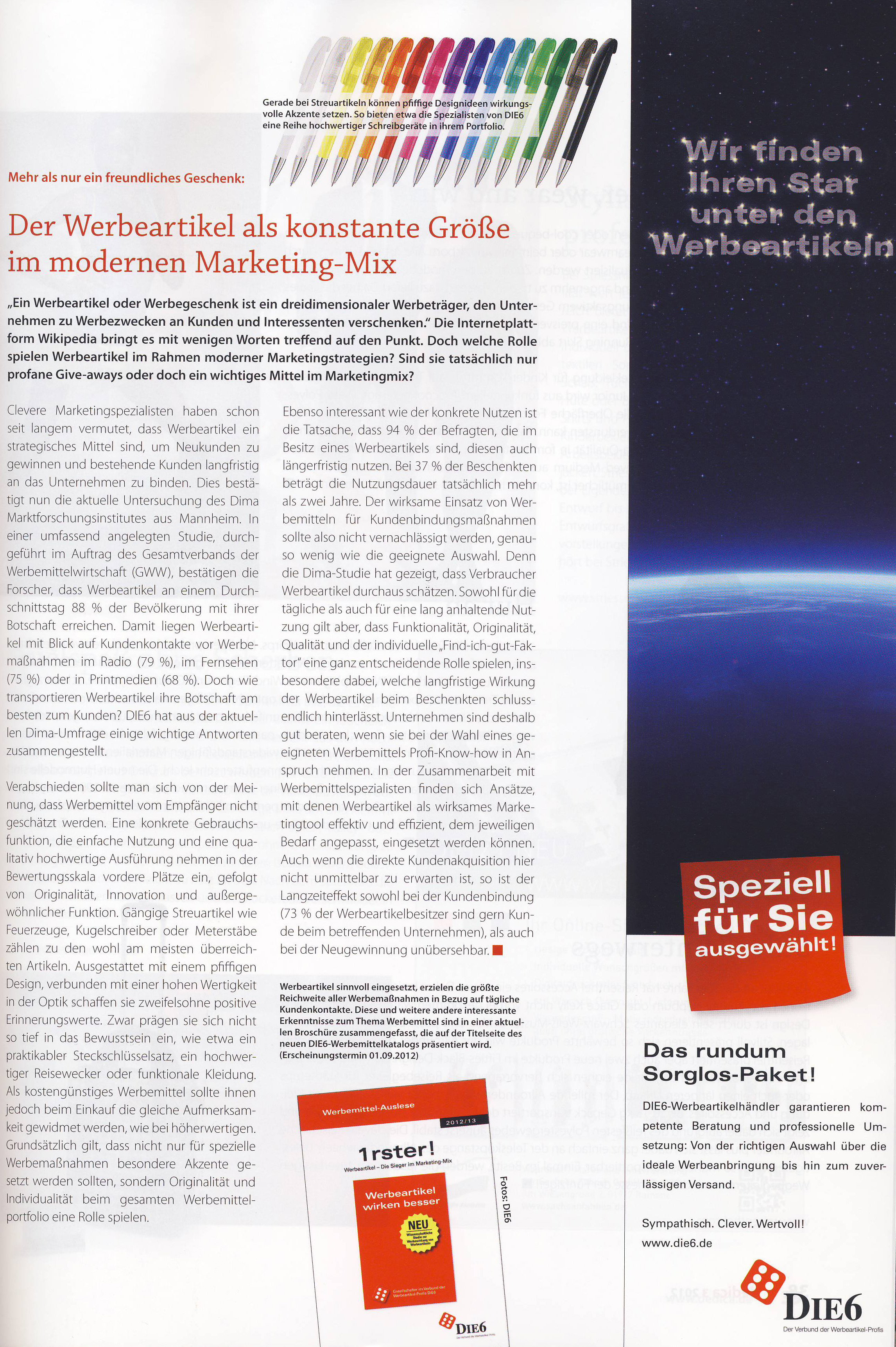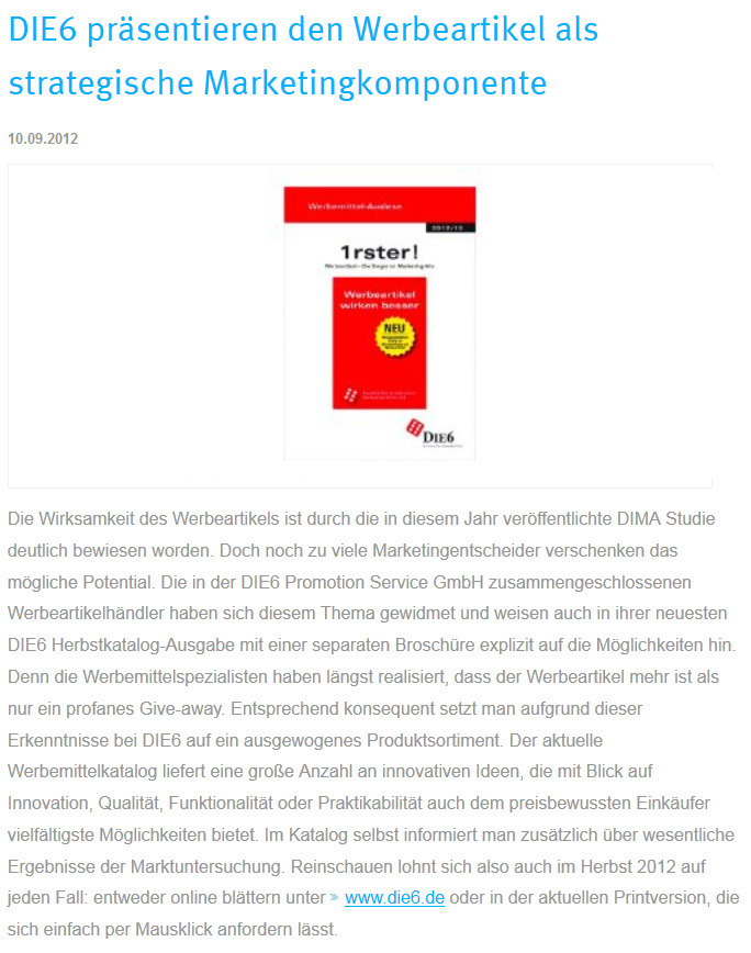 Im DIE6-Pressearchiv finden Sie zahlreiche Artikel und Informationen vom und über das Profi-Netzwerk der Werbeartikel-Unternehmer.